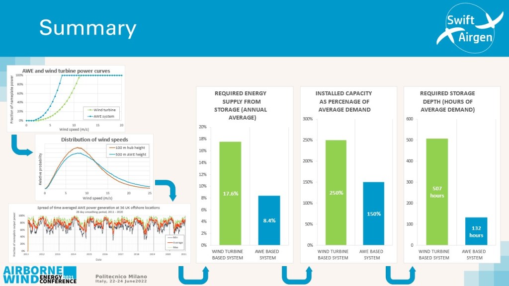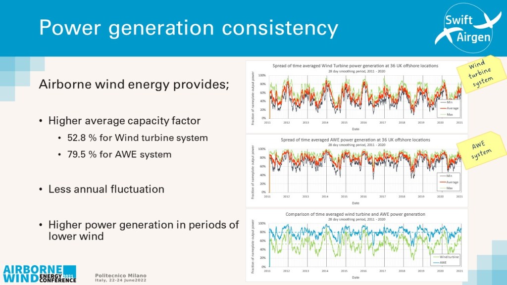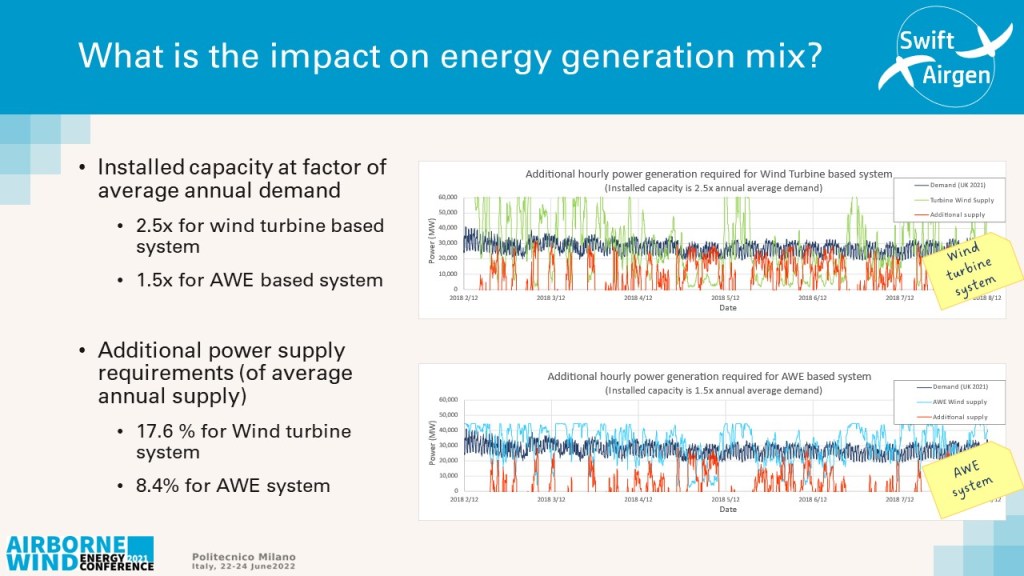 As a result, the overall installation capacity and costs for this renewable generation system are significantly less for an airborne wind energy based system compared to a wind turbine based supply system.