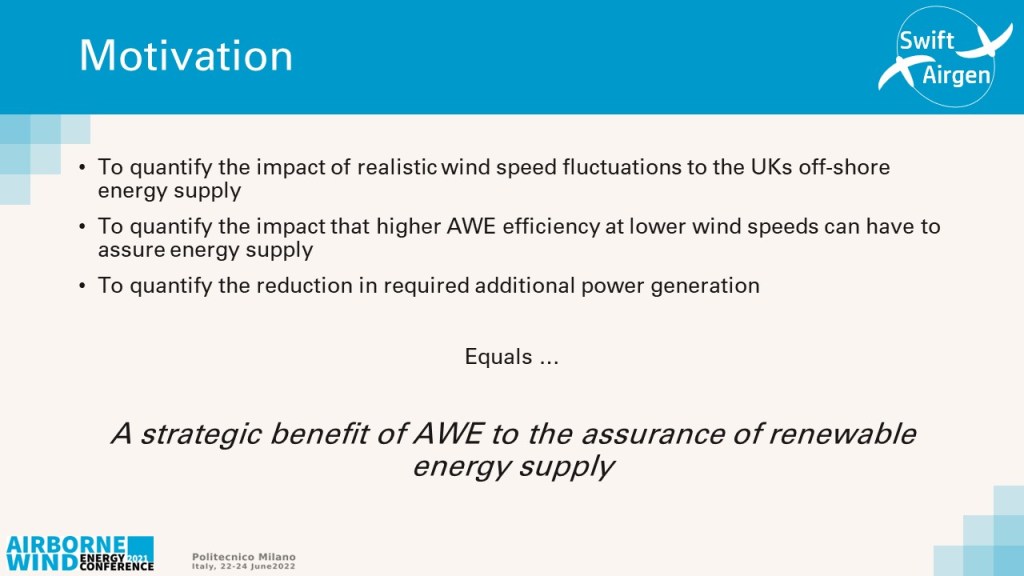 I suspected that AWE may be able to show significant benefits and I want to quantify this and to understand what this may mean for energy security. Ultimately, I want to encourage governments to more seriously consider AWE as part of the solution to deliver assured renewable generation and to therefore encourage funding for AWE research and development.