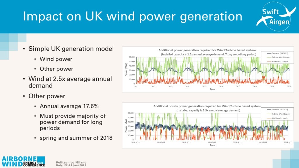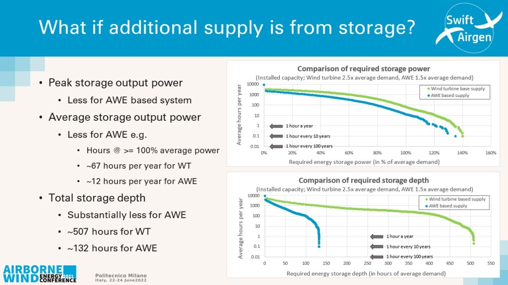 Importantly to provide assured supply the total storage depth for a wind turbine-based system would need to be in excess of 500 hours average demand whereas for the airborne wind energy system it would only need to be 132 hours in depth. This is to be confident of the storage depth not falling to zero charge more often than 1 hour per 100 years.