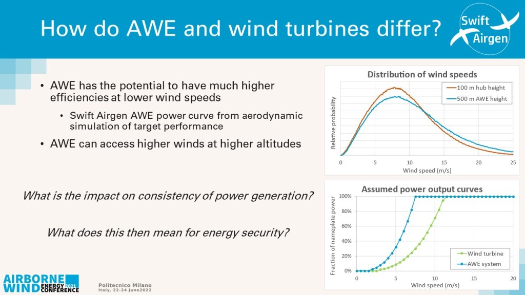 The are two key areas, the first is that AWE typically operates at higher altitude and the top chart shows the difference of wind speed distribution between a 100 m hub height (red line) (typical for a horizontal axis wind turbine) and a 500 m airborne wind energy average height (blue line).